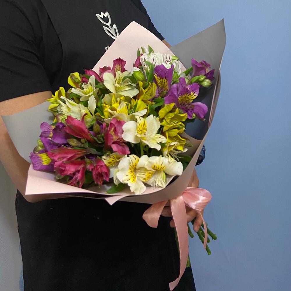 альстромерия микс – 9 шт.Упаковка – 1 шт.Атласная лента – 1 шт.