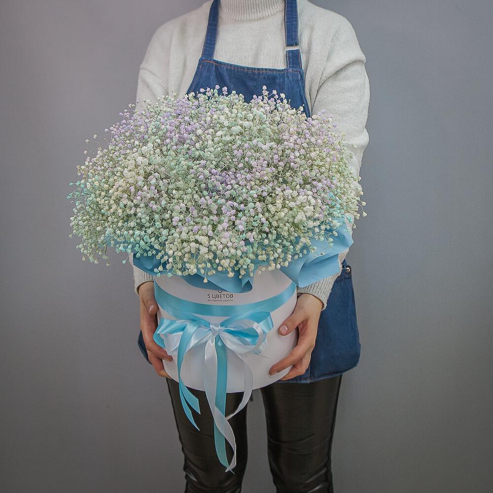 Букет цветов из 15 радужной гипсофилы в шляпной коробке