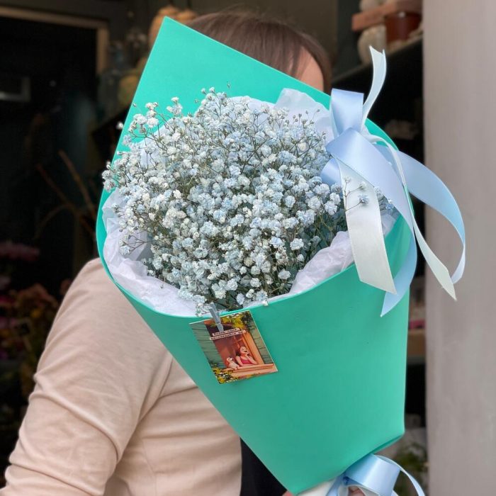 Лента – 1 шт.Упаковка – 1 шт.Тишью – 1 шт.Открыточка с вашими пожеланиями – 1 шт.Гипсофила крашеная – 3 шт.