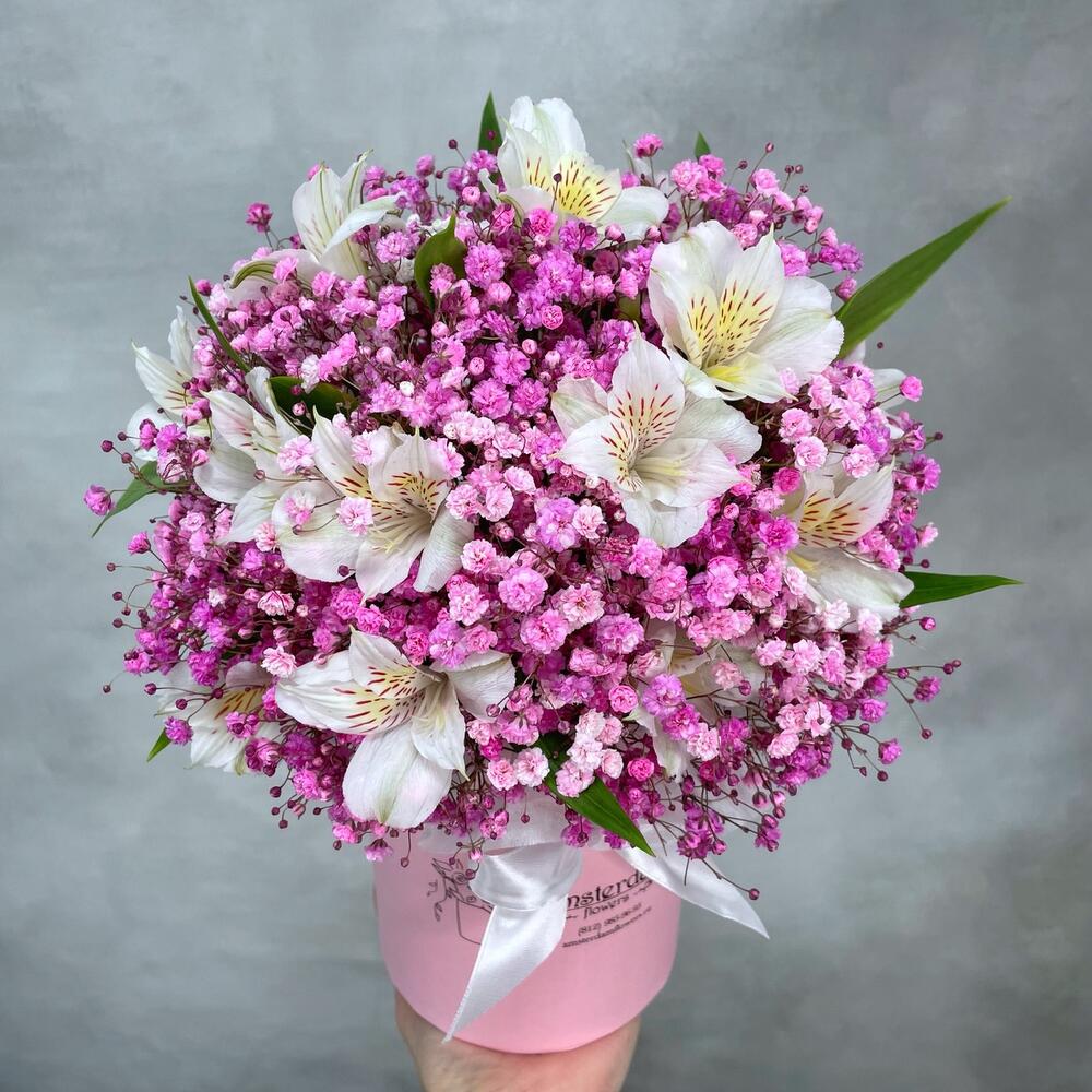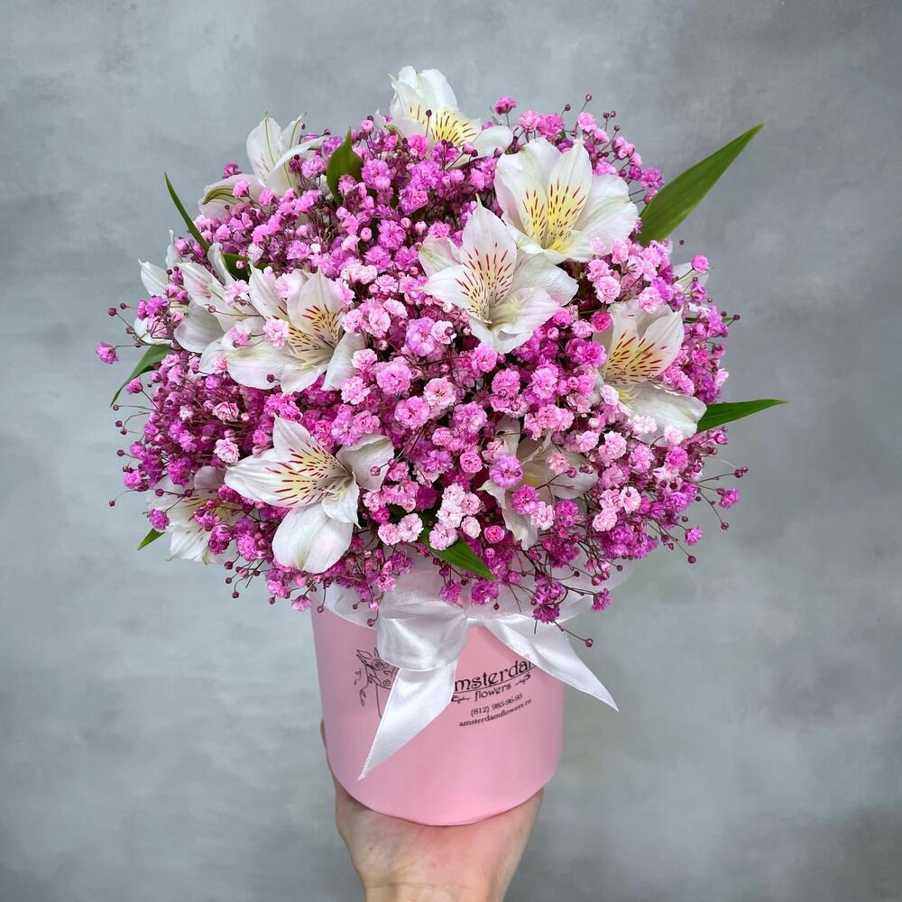 Коробочка из нежной розовой гипсофилы со стойкой изящной альстромерией. Стильная композиция для мамы, жены, подруги, любимой девушки, коллеги или партнёра по бизнесу.