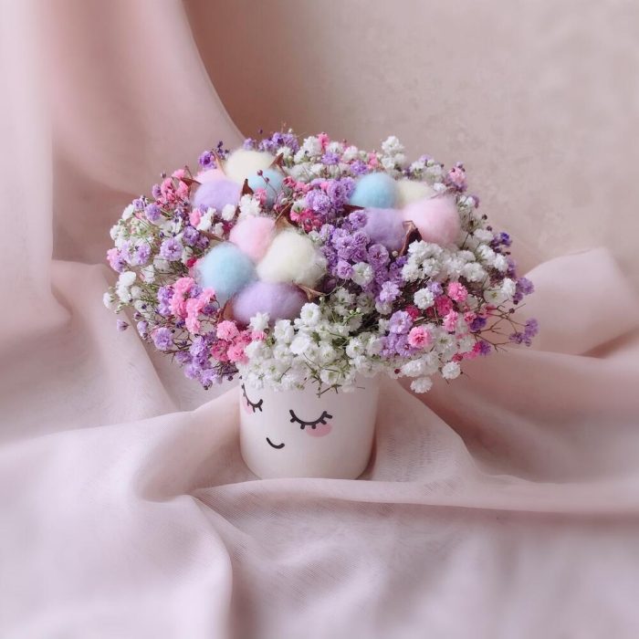 Флористическая губка – 1 шт.Кашпо керамика – 1 шт.Инструкция по уходу – 1 шт.гипсофила радужная – 3 шт.хлопок радужный – 3 шт.