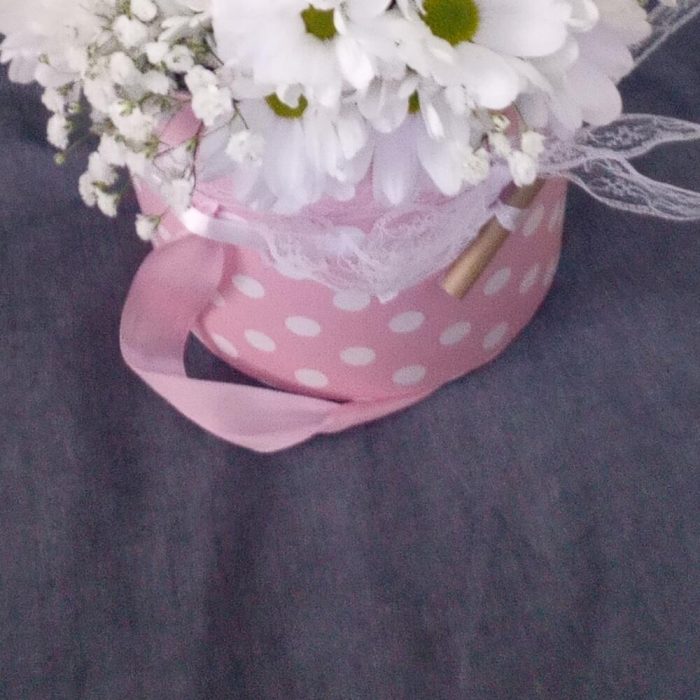 Ромашка – 25 шт.Гипсофила – 9 шт.Шляпная коробка – 1 шт.Флористическая губка – 1 шт.Лента – 1 шт.
