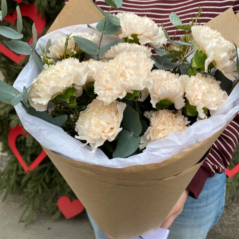 Букет диантусов с эвкалиптом в крафте