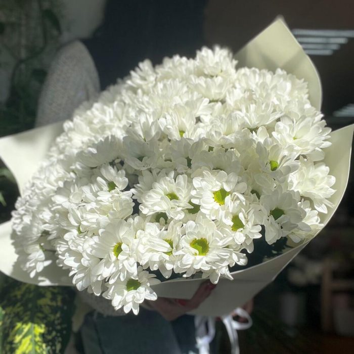 Оригинальный букет из хризантем похожей на ромашку. После срезки этой хризантемы она длительное время сохраняет свою свежесть и стойкость.Хризантема очень изящный, практичный, стойкий цветок, который завоевал необычную популярность на рынке свежесрезанных цветов. Она … Показать ещёсоставляет основу для изготовления легких и романтических букетов. Жемчужно-белые цветы с сердцевиной салатового цвета могут великолепно смотреться как в моно букете, так и в букете с другими цветами.