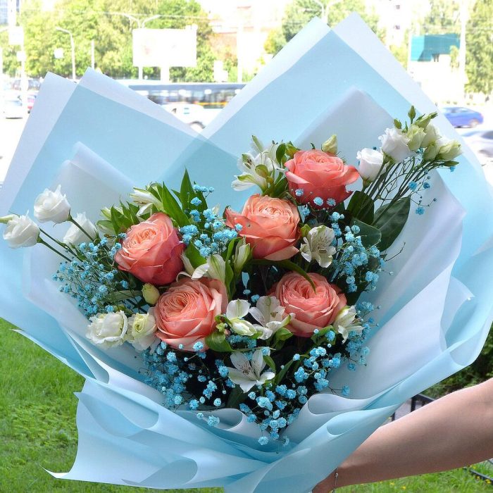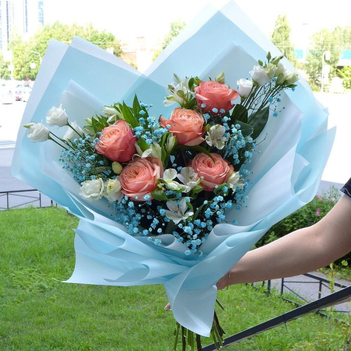 Альстромерия – 5 шт.Гипсофила – 3 шт.Лизиантус – 3 шт.Стильная упаковка – 1 шт.розы пионовидные – 5 шт.