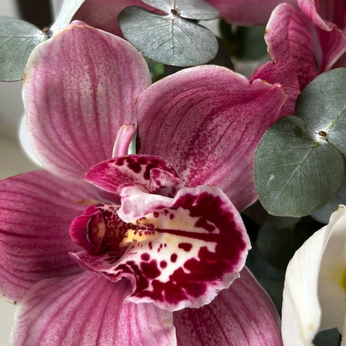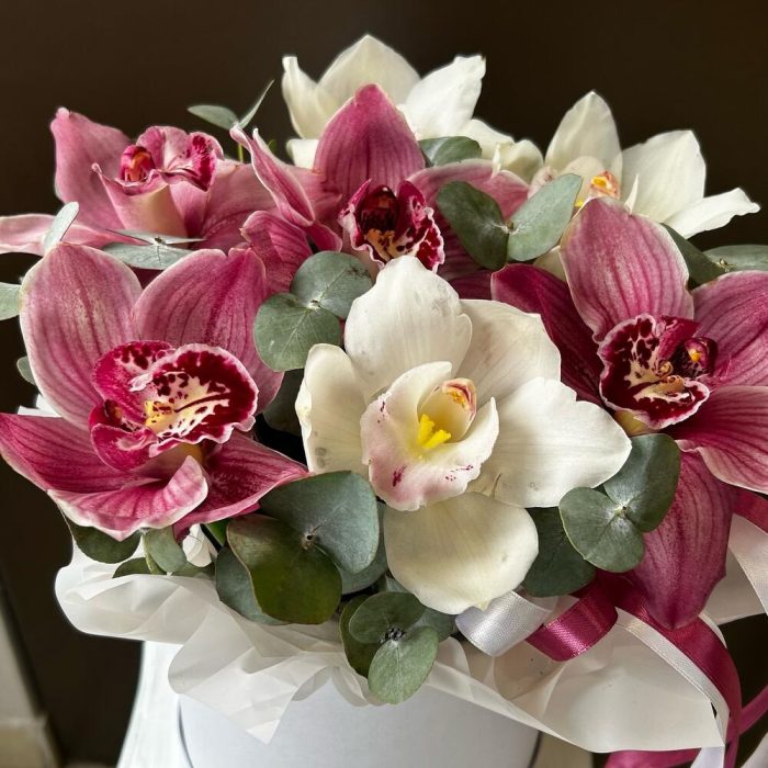 Коробка шляпная – 1 шт.Пиафлор (оазис) – 1 шт.Упаковка дизайнерская – 2 шт.Эвкалипт – 3 шт.Орхидея Цимбидиум – 7 шт.
