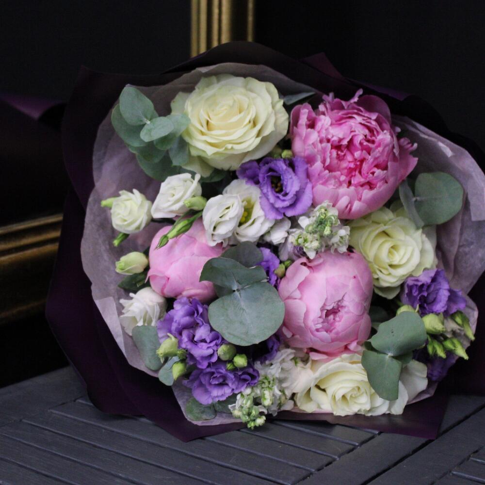 Эвкалипт – 1 шт.Тишью – 2 шт.Пион Сара Бернар – 3 шт.Роза Мондиаль – 3 шт.Маттиола белая – 2 шт.Пленка матовая – 2 шт.эустома белая – 1 шт.эустома лавандовая – 2 шт.