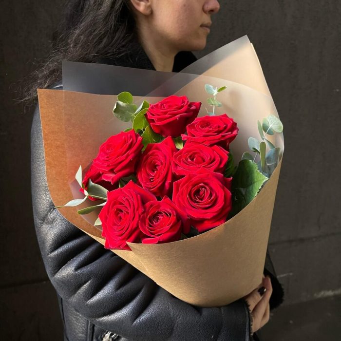 Эвкалипт – 3 шт.Упаковка дизайнерская – 3 шт.Роза красная 50 см – 9 шт.
