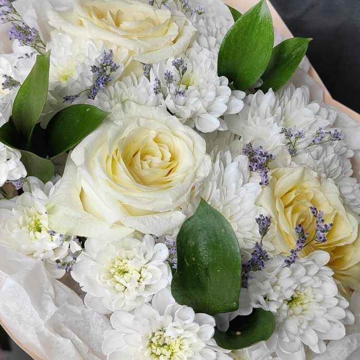 Букет ароматных роз, хризантемы и лилового лимониума “Нежность”