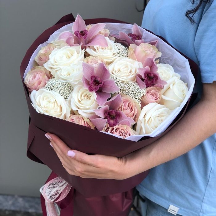 Озотамнус – 4 шт.Орхидея Цимбидиум – 5 шт.Писташ – 3 шт.Тишью – 2 шт.Пионовидная роза – 10 шт.Упаковка дизайнерская – 5 шт.Роза пинк мондиаль – 9 шт.лента премиум – 5 шт.