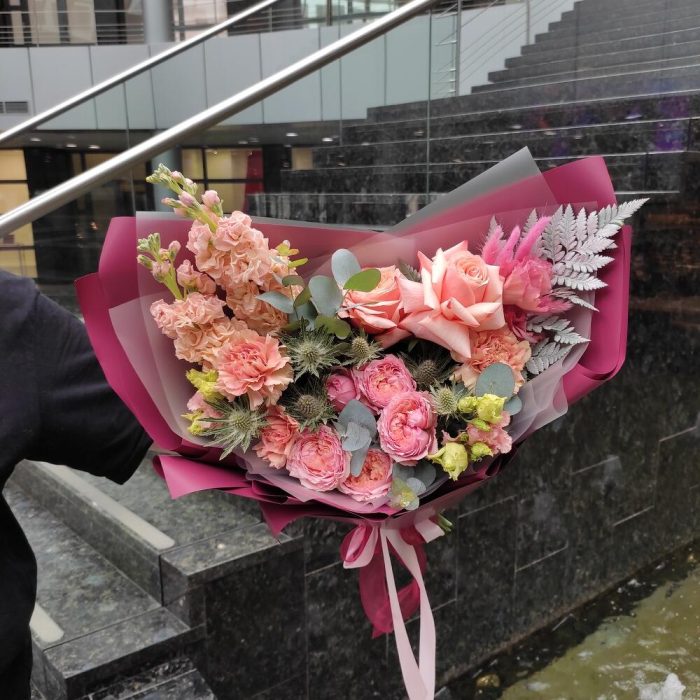 кахала роза – 2 шт.маттиола персиковая – 2 шт.джульетта роза пионовидная – 1 шт.Диантус – 3 шт.Эрингиум – 1 шт.Папоротник – 1 шт.Лагурус (сухоцвет) – 3 шт.Упаковка дизайнерская – 1 шт.