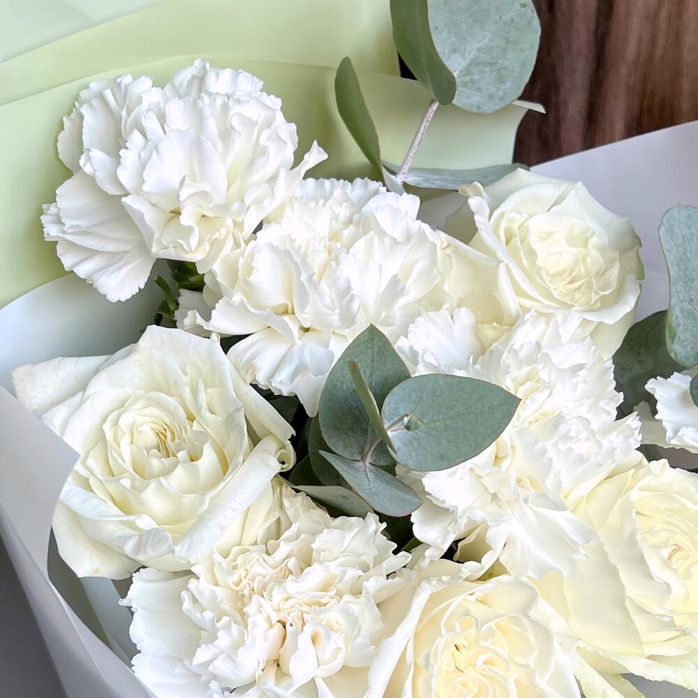 Роза Эквадор – 4 шт.Гвоздика – 5 шт.эвкалипт cineria – 2 шт.Дизайнерская упаковка – 1 шт.Лента – 1 шт.