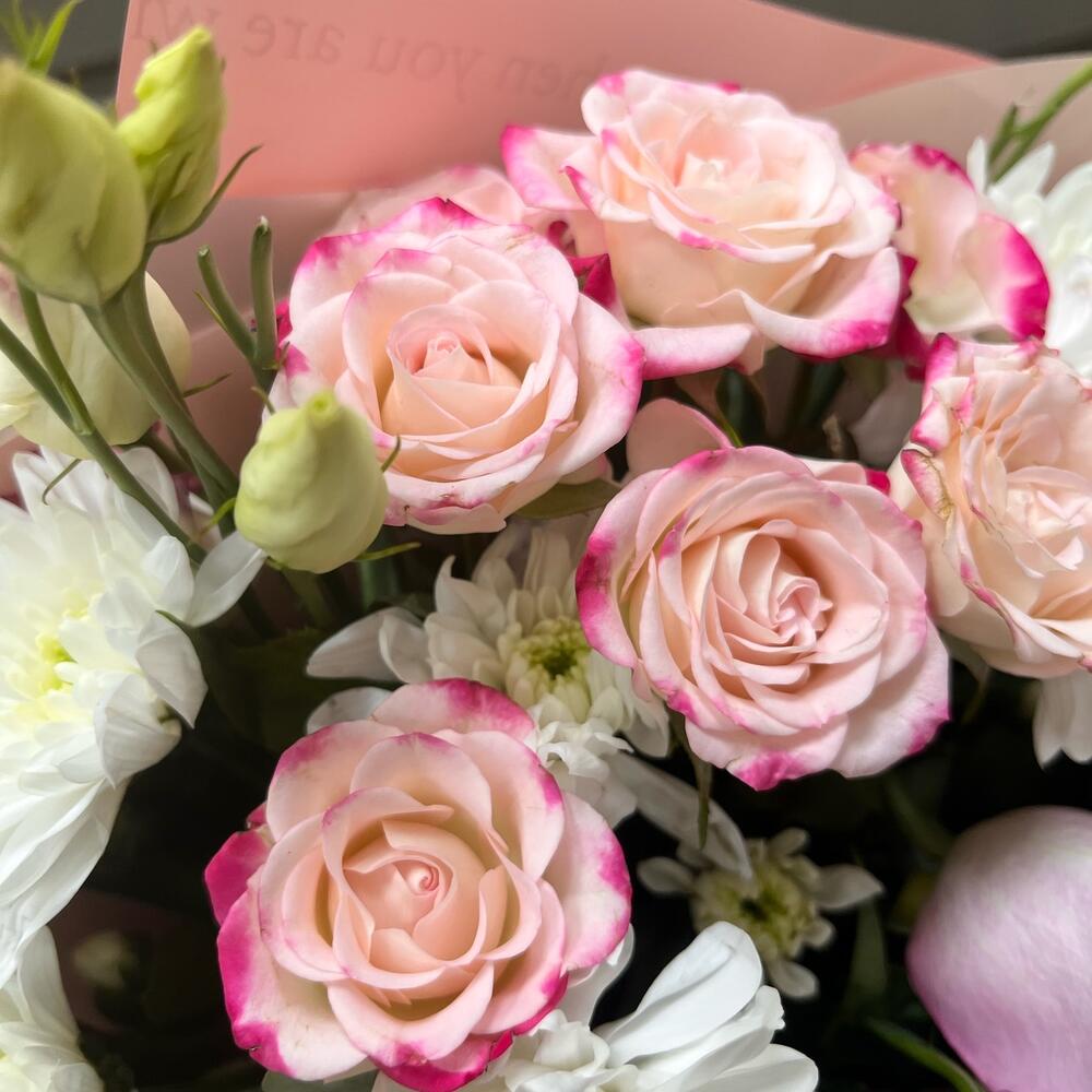 Категории: Кустовые розы, Лизиантусы, Розы, Хризантемы