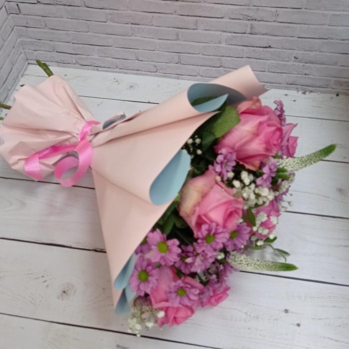 Роза Эквадор – 7 шт.Сантини – 5 шт.Гипсофила – 1 шт.Вероника – 2 шт.Статица – 1 шт.Фисташка пучок – 1 шт.Упаковка дизайнерская – 1 шт.