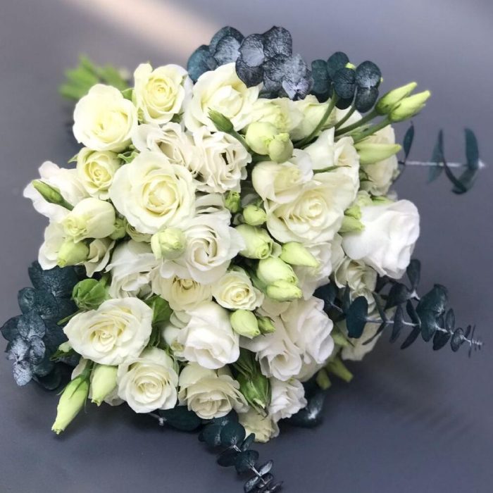 Лизиантус – 5 шт.Кустовая роза – 5 шт.Лента атласная – 3 шт.Эвкалипт Baby Blue – 3 шт.
