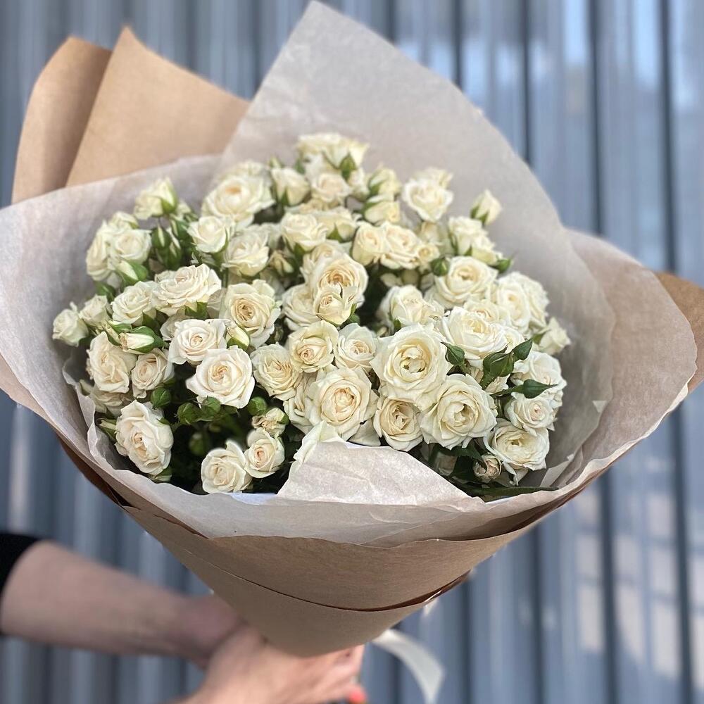 Лента атласная – 1 шт.Упаковка крафт дизайнерский – 1 шт.роза кустовая крем грациия 50 см – 19 шт.