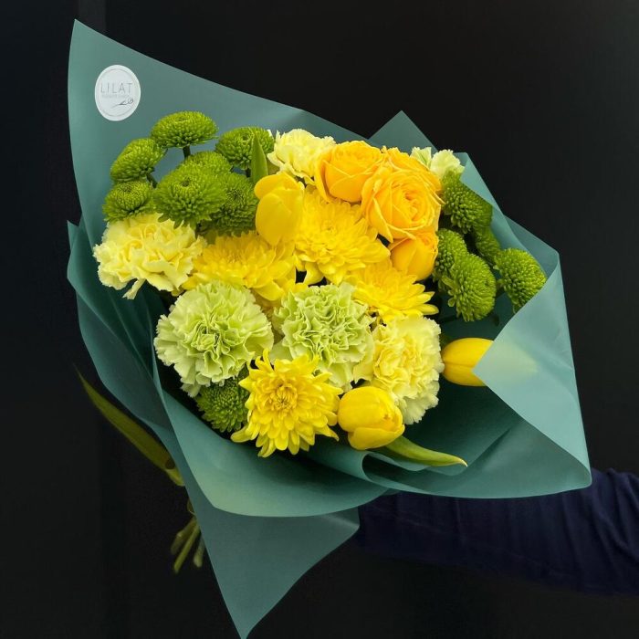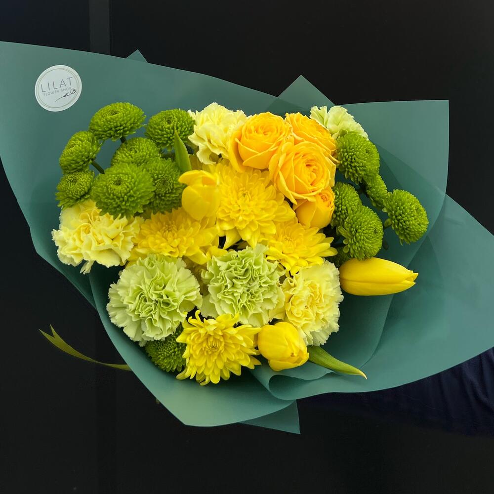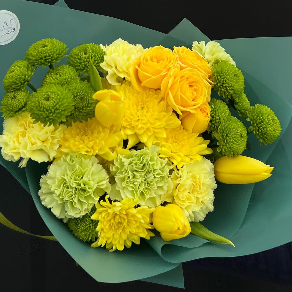 Тюльпан – 3 шт. Хризантема кустовая – 5 шт. Диантус – 5 шт. Упаковка дизайнерская – 3 шт. Открыточка с вашими пожеланиями – 1 шт. инструкция по уходу за цветами – 1 шт. куст роза – 1 шт.