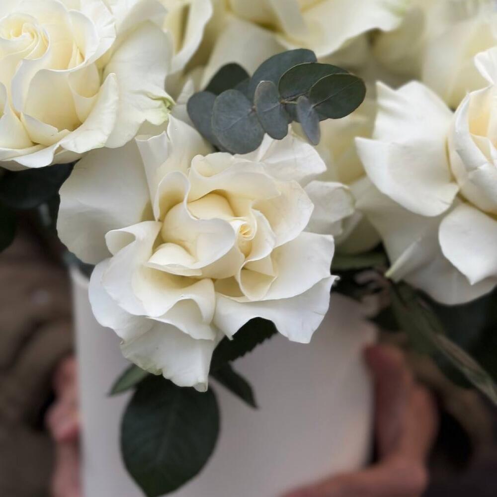 Французские жемчужные розы с ароматным эвкалиптом в шляпной коробке
