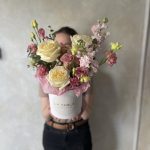 Лизиантус – 1 шт.Маттиола – 2 шт.Эвкалипт – 1 шт.Роза – 4 шт.Шляпная коробка – 1 шт.Оазис флористический – 1 шт.