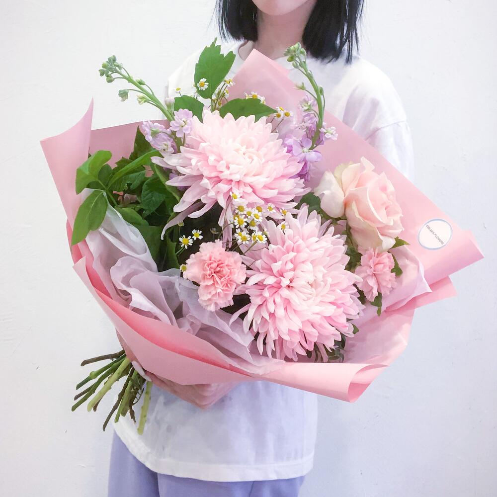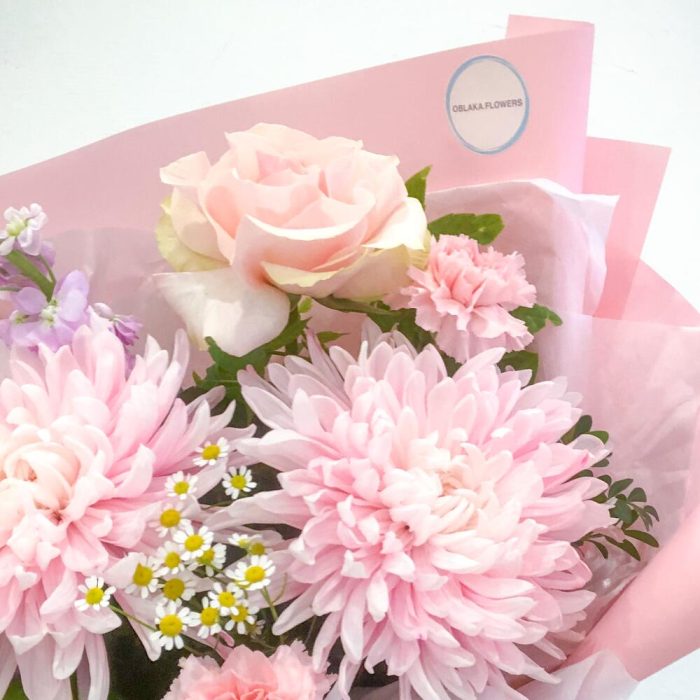 Маттиола – 2 шт.Лента атласная – 1 шт.Тишью – 1 шт.Диантус – 2 шт.Матрикария – 3 шт.Фисташка – 3 шт.Хризантема Антонов – 2 шт.Роза французская – 1 шт.Аквапак – 1 шт.Корейская пленка – 3 шт.ветки декоративные – 2 шт.