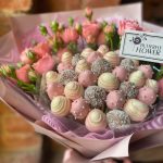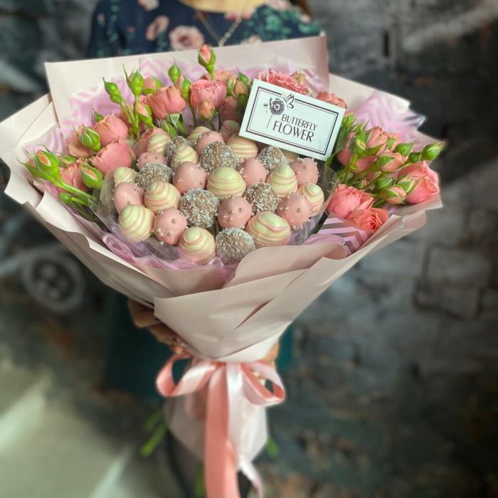 Съедобный фруктовый букет из клубники в шоколаде и роз в стильной упаковке