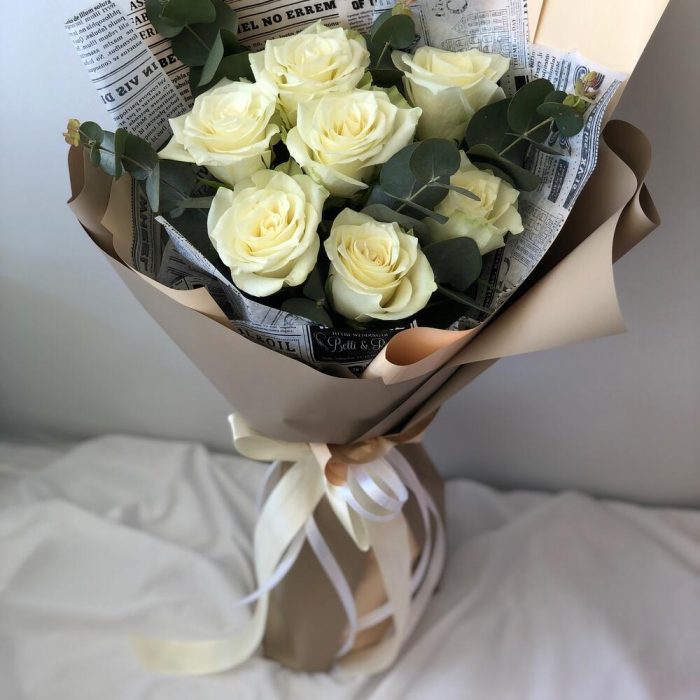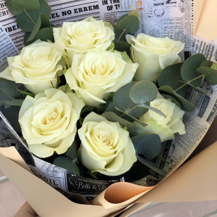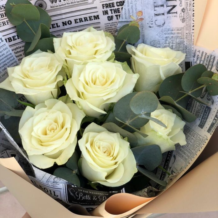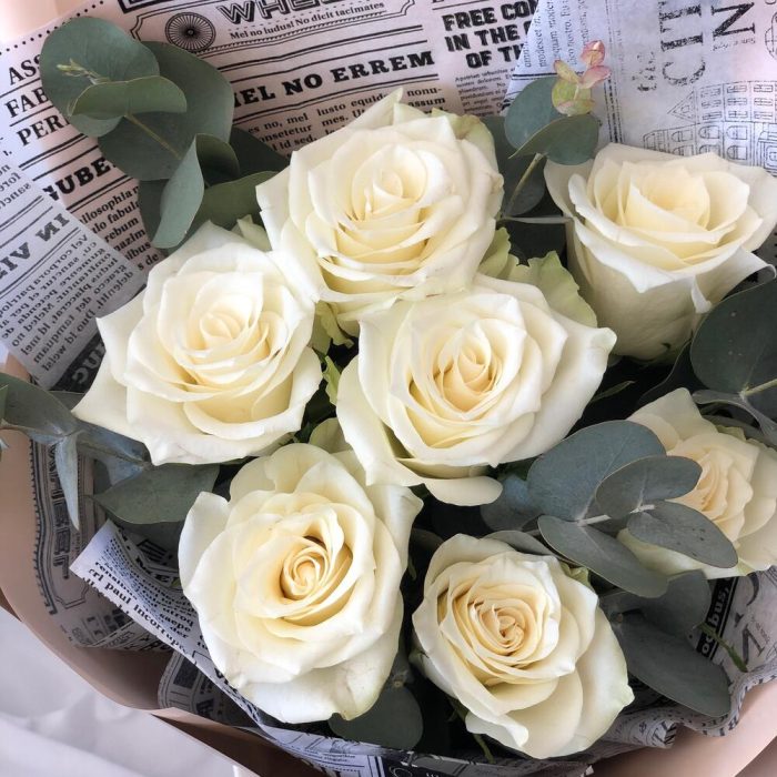 Семь белых роз с эвкалиптом