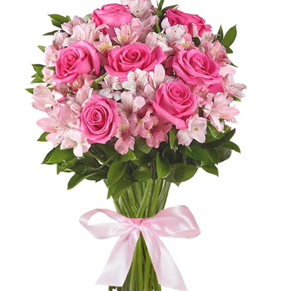 лента атласная (розовый) – 1 шт.альстромерия (белый) – 3 шт.альстромерия (розовый) – 4 шт.роза одноголовая розовый – 5 шт.