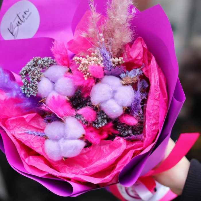 Хлопок – 3 шт.Сетария – 2 шт.Сухоцветы – 10 шт.Папоротник – 2 шт.Дизайнерская упаковка – 1 шт.Открыточка с вашими пожеланиями – 1 шт.Шоколадка – 1 шт.