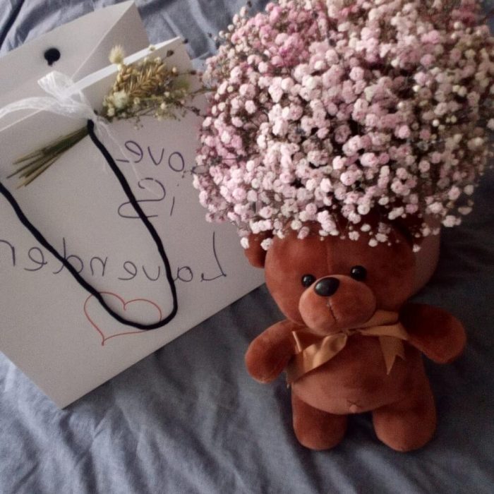 Гипсофила – 25 шт.Лаванда – 35 шт.Шляпная коробка – 1 шт.Флористическая губка – 1 шт.Мишка плюшевый – 1 шт.Пакет подарочный – 1 шт.